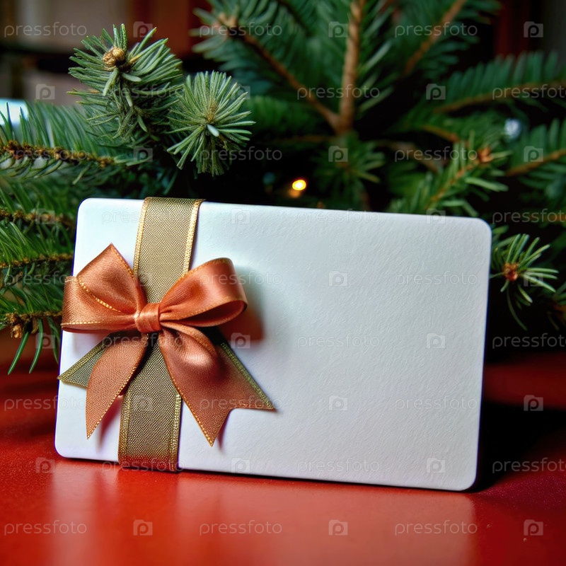 Белая подарочная карта с оранжевой лукой, украшенной на Рождество