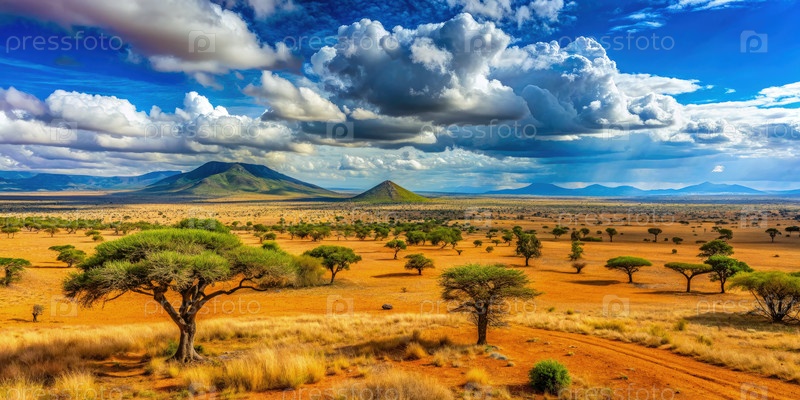 Панорамный вид на кенийскую Саванну под голубым небом