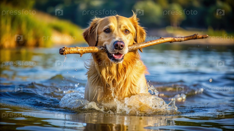 Золотой ретривер несет палку из воды. генеративный ИИ