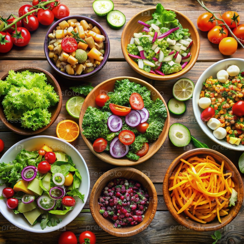 Красочное разнообразие салатов и овощных блюд на деревянном столе