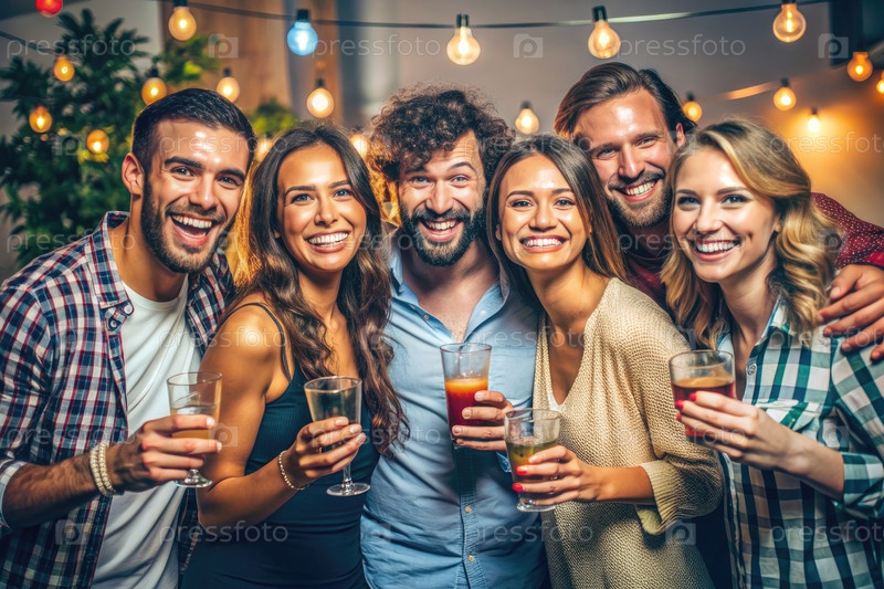 Счастливые друзья наслаждаются напитками на вечеринке во дворе