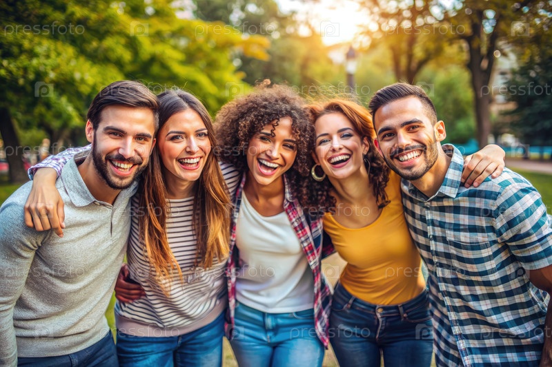Счастливые друзья, улыбающиеся вместе в парке в солнечный день