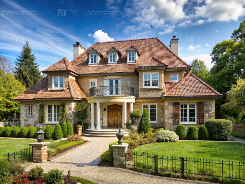 Большой каменный дом с коричневой крышей и каменной дорожкой