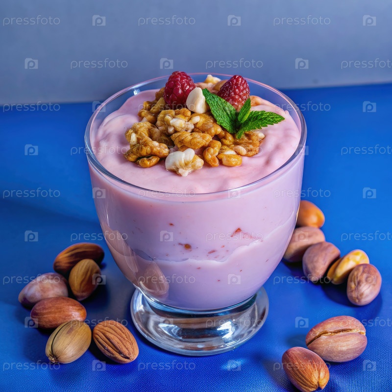 Розовый йогурт с орехами и ягодами в стеклянной чашке на синем фоне