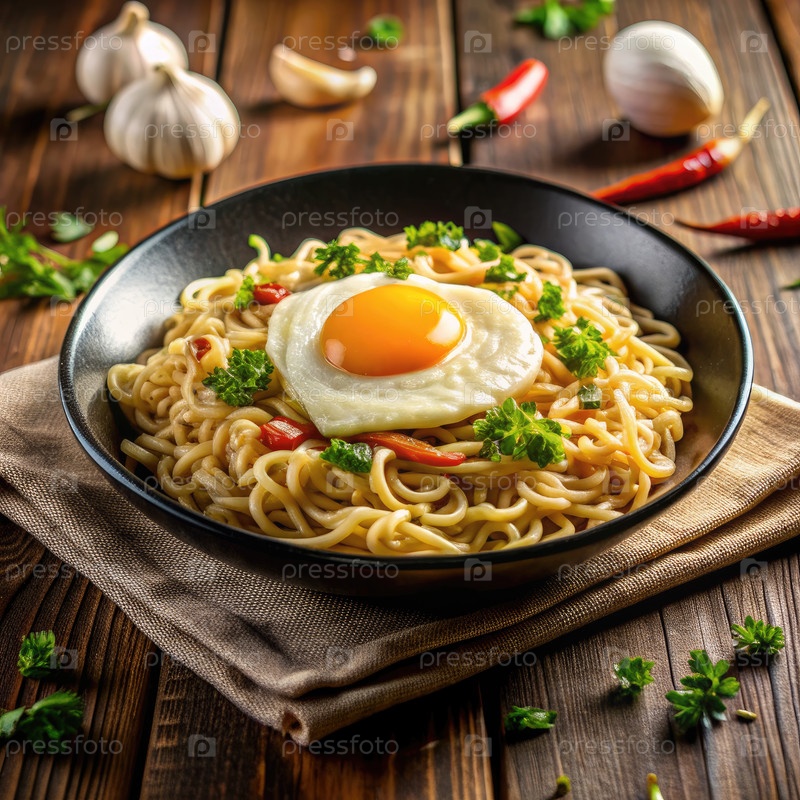 Ближайшее изображение мгновенных лапши с жареным яйцом и травами на деревянном столе
