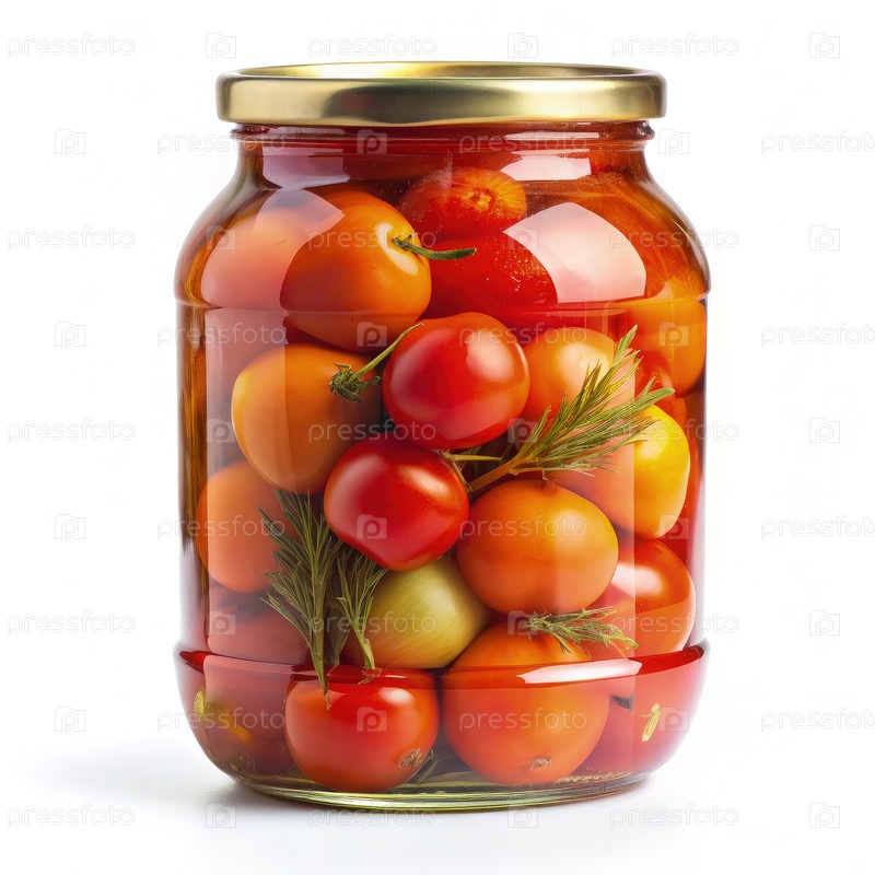 Стеклянная банка, наполненная маринованными помидорами на белом фоне