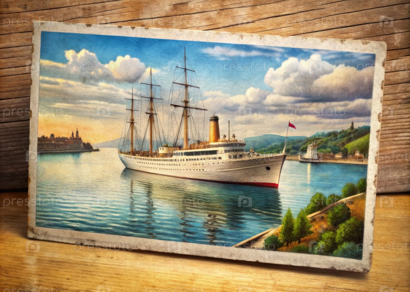 Винтажная открытка белого пассажирского судна в гавани