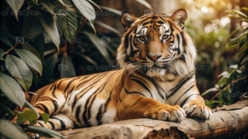 Величественный тигр, отдыхающий на бревне в пышном зеленом джунглях