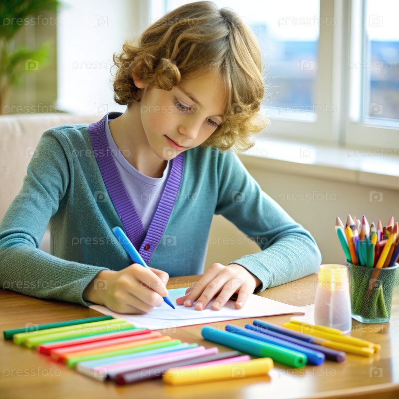 Молодой художник сосредоточился на рисовании с помощью felt tip pens дома