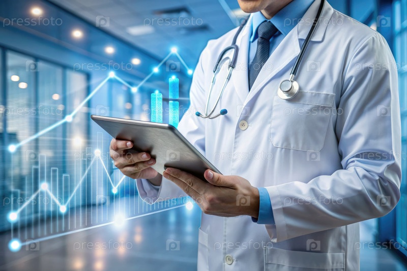 Врач изучает данные о планшете в современном медицинском учреждении