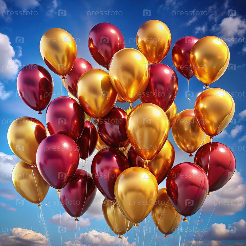 Группа коричневых и золотых воздушных шаров, плавающих в голубом небе