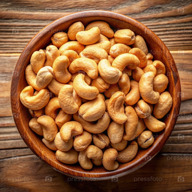 Наземный вид орехов кешью в деревянной миске на рустическом столе