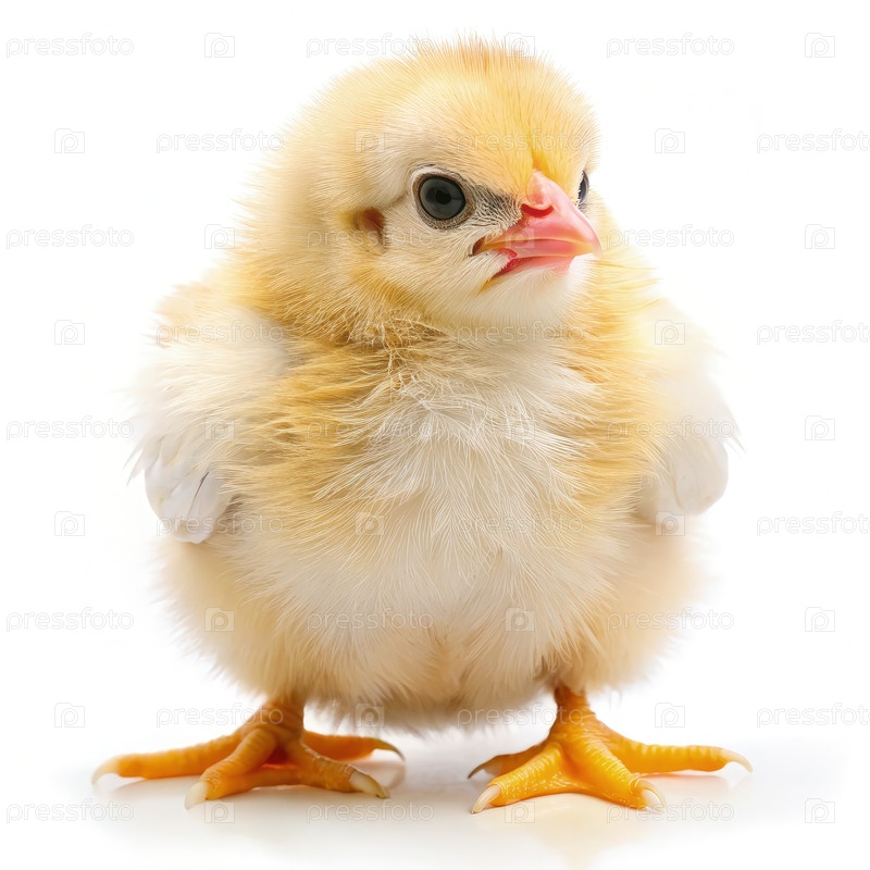 Крошечный желтый цыпленок с нежным оперением стоит на белом фоне