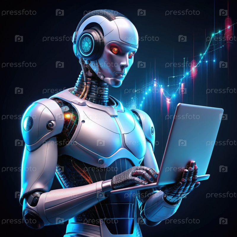 Futuristic AI Trader Robot Анализ данных рынка криптовалют. генеративный ИИ