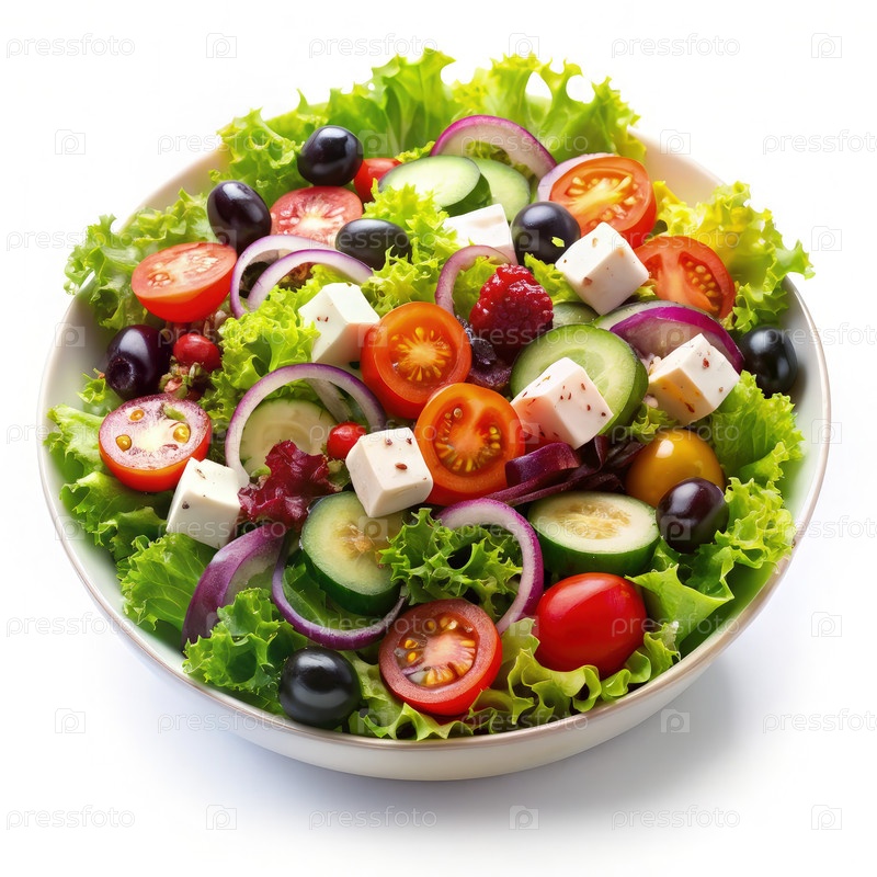 Свежий зеленый салат с сыром фета, помидорами, огурцами и маслинами