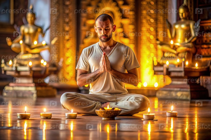 Человек медитирует с масляными лампами в традиционном храме