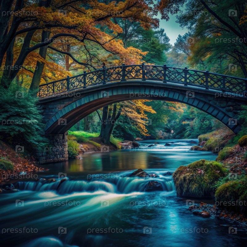 Мост через спокойную реку в Осеннем лесу