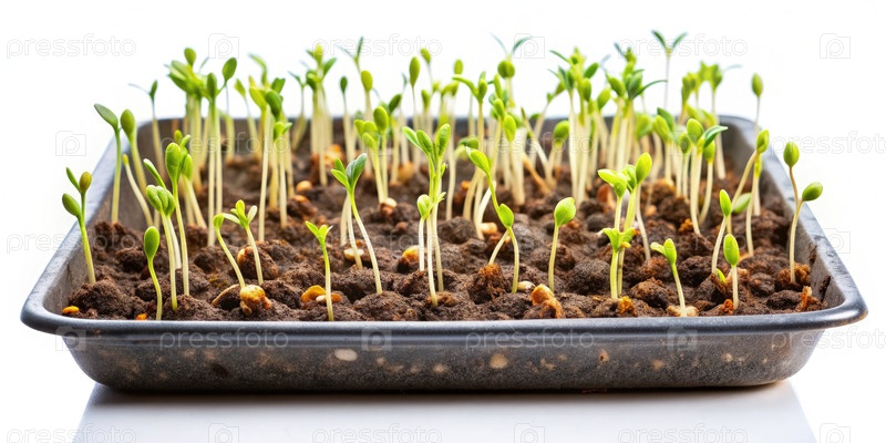 Саженцы, выходящие из почвы в черном подносе на белом фоне
