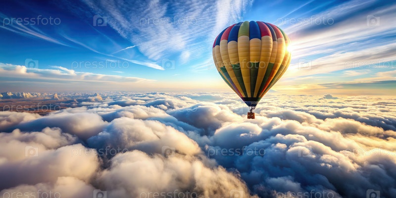 Красочный воздушный шар, летящий над морем облаков на восходе солнца