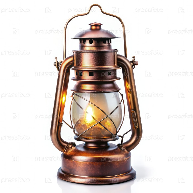 Традиционный медный фонарь со стеклянной тенью и зажженным пламенем на белом фоне