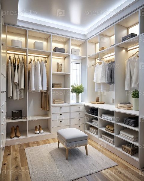 Минималистский гардероб с белыми шкафами и естественным светом. генеративный современный ИИ