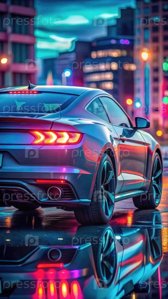 Задний вид спортивного автомобиля в городской обстановке во время сумерек