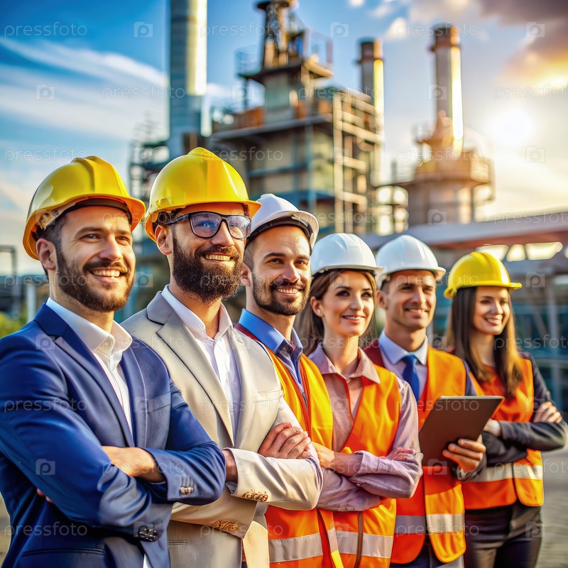 Уверенные инженеры в жестких шляпах стоят перед промышленным объектом на закате