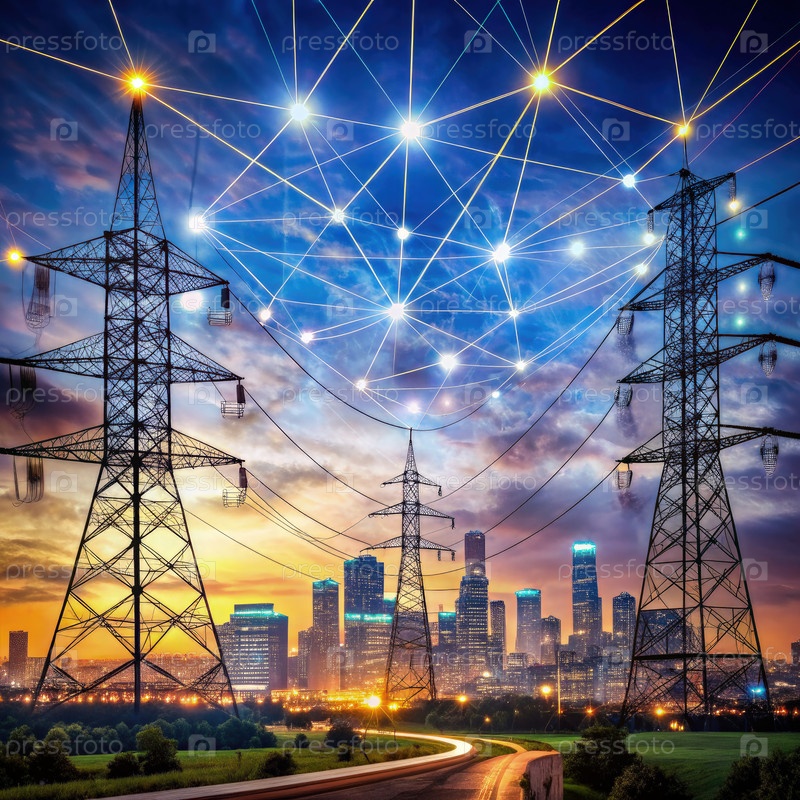 Сеть умных сетей соединяет городской пейзаж на рассвете. генеративный ИИ