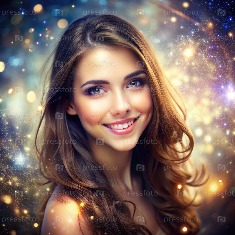 Улыбающаяся молодая женщина с длинными коричневыми волосами на блестящем фоне