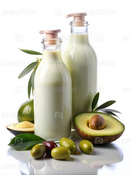 Боковый вид бутылок шампуня с авокадо и оливками