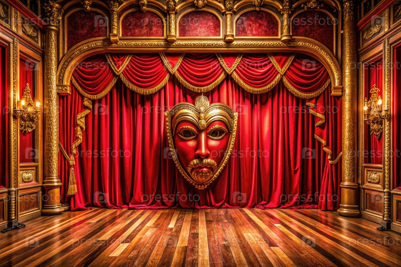 Украшенная театральная сцена с красными занавесками и драматической маской