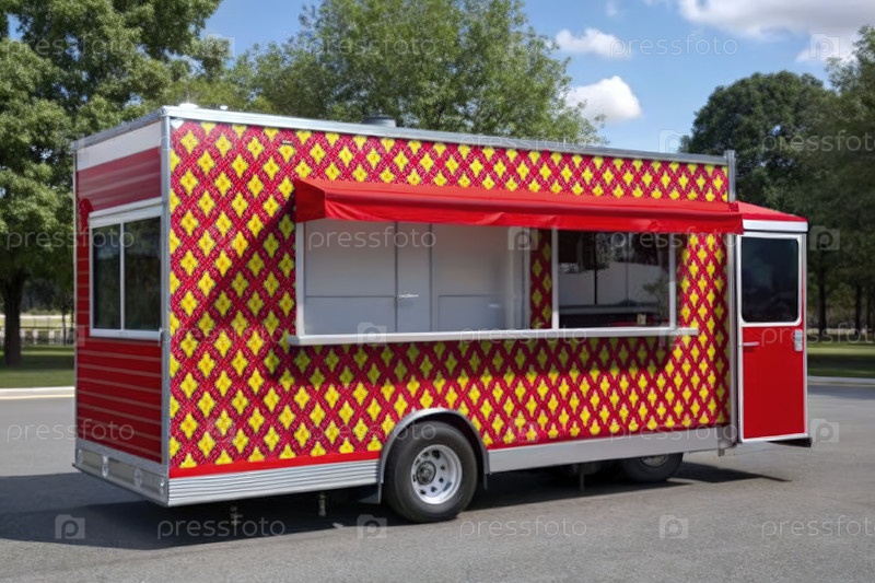 Дизайн стойки пищевого грузовика Paella с красным и желтым алмазным узором. генеративный современный ИИ
