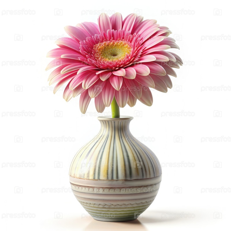 Розовая гербера-дези в полосатой керамической вазе на белом фоне