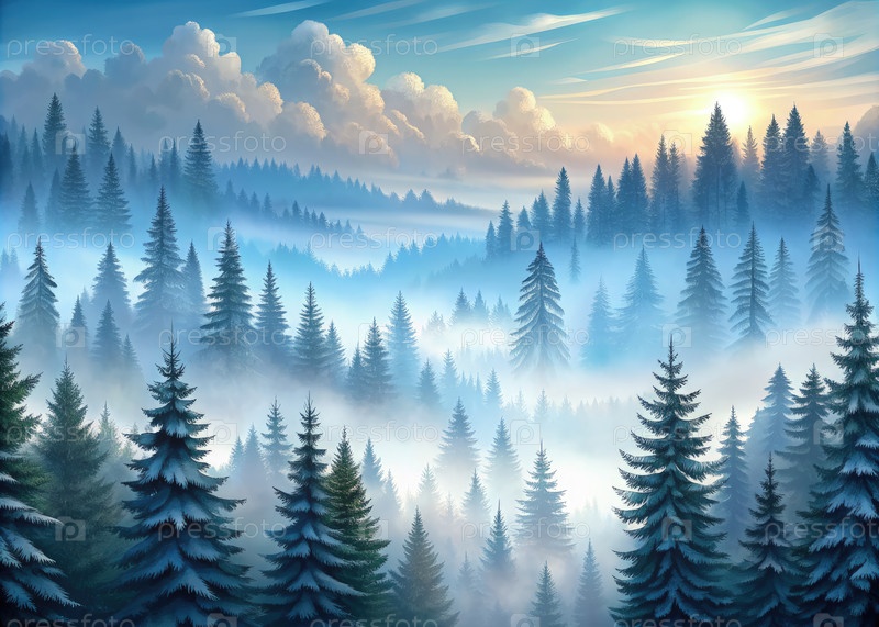 Туманное утро в вечнозеленом лесу