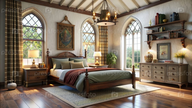 Уютная спальня с арочными окнами и деревянной кроватью