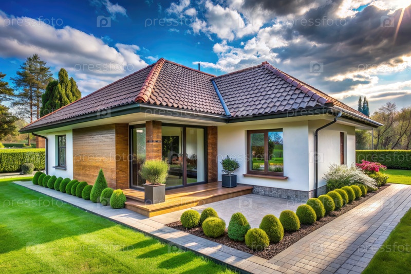 Белый дом с коричневой крышей и озелененным двором в солнечный день