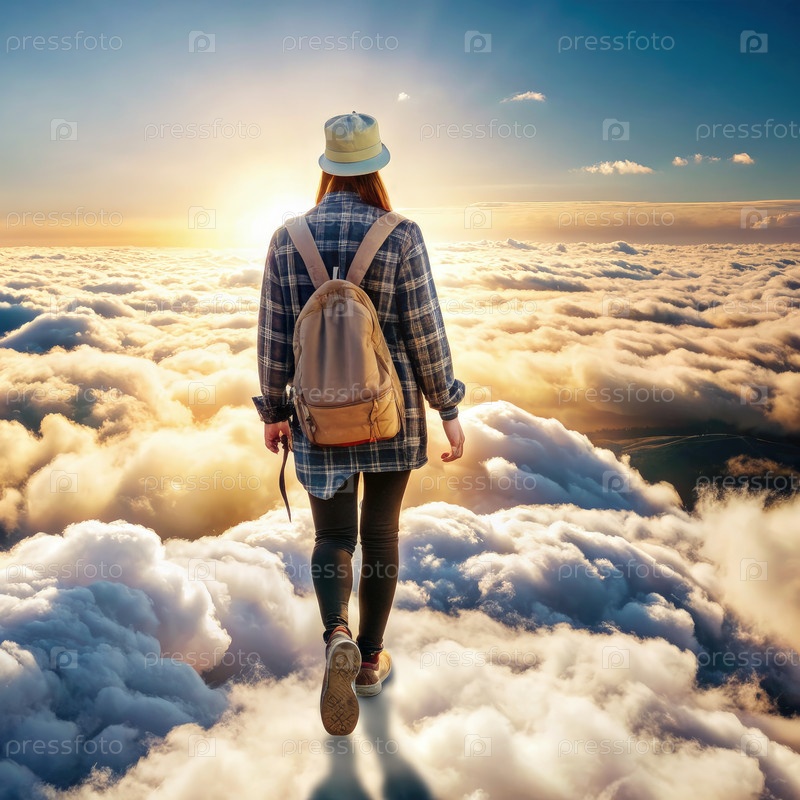 Женщина, идущая на облаках при закате солнца
