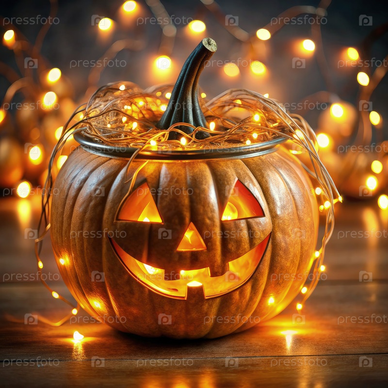 Вырезанная тыква с светодиодными огнями на деревянном столе