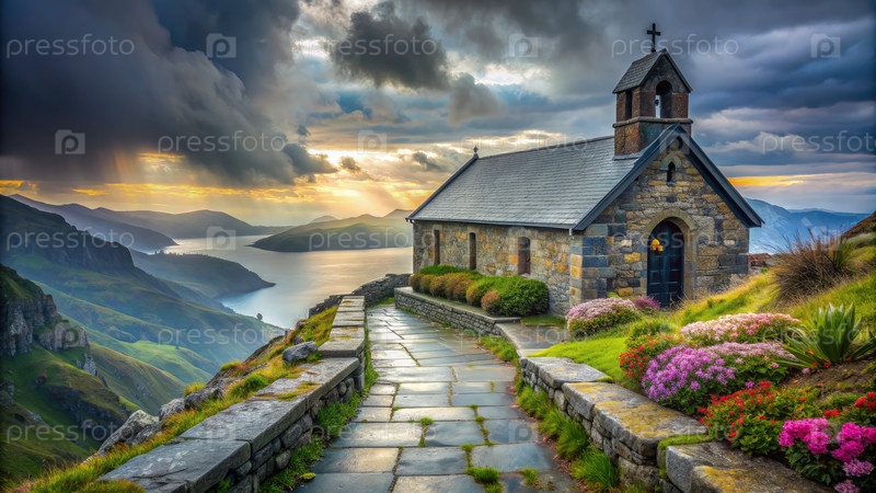 Каменная церковь на вершине горы с драматическим закатом солнца над водой