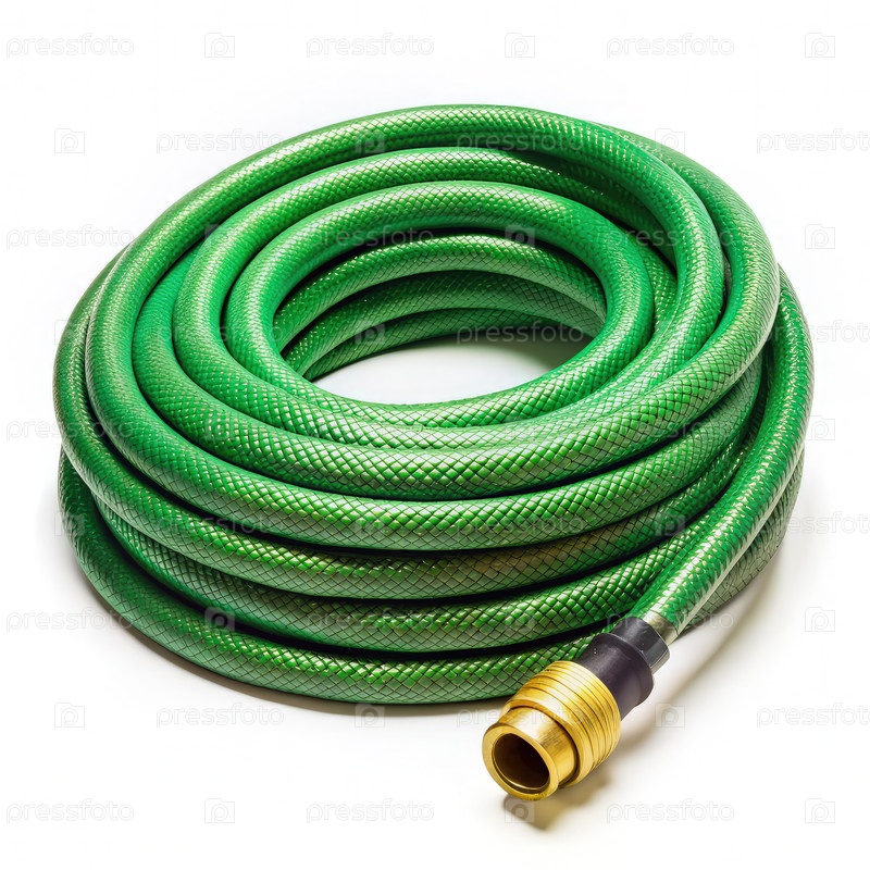 Зеленый садовый шланг, свернутый на белом фоне