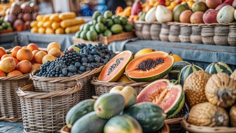 Вибрирующий рыночный стенд, демонстрирующий свежие фрукты и овощи. генеративный ИИ