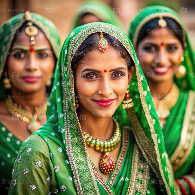 Три индийские женщины, одетые в зеленые сари и ювелирные украшения улыбаются на камеру