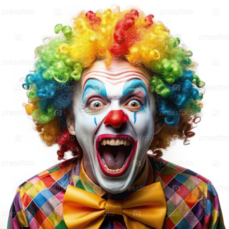 Портрет кричащего клоуна в красочном костюме