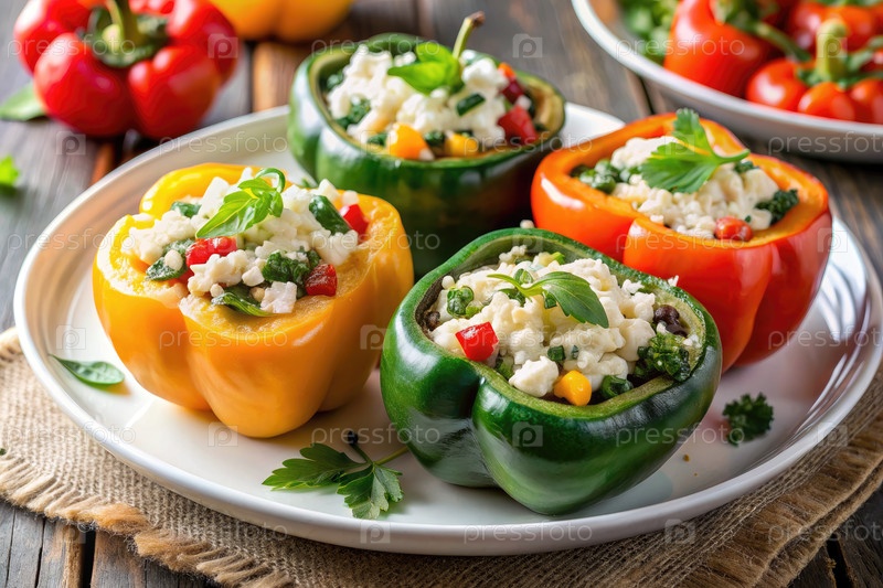 Красочные фаршированные перцы со шпинатом и сыром фета на белой тарелке