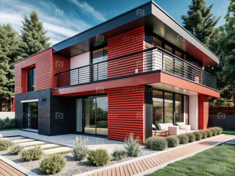 Красный дом с черными акцентами и балконом в пышно-зеленом ландшафте