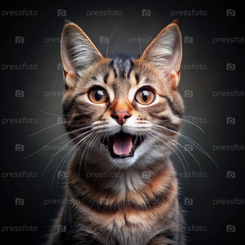 Счастливый кот Табби с открытым ртом на темном фоне