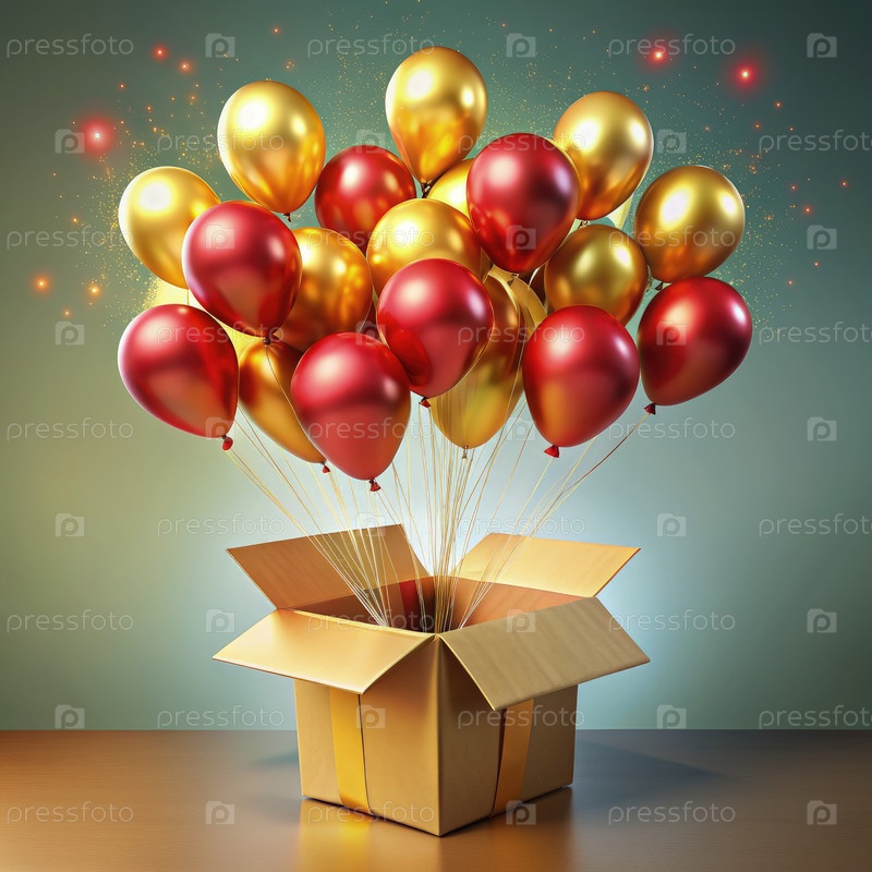 Золотая коробка, наполненная красными и золотыми воздушными шарами, удивляет празднованием