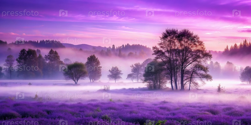 Фиолетовый туман окутывает поле лаванды на восходе солнца