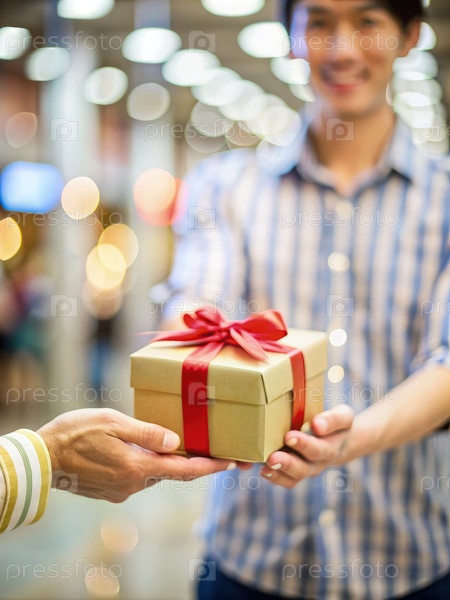 Человек, получающий подарочную коробку с улыбкой в хорошо освещенной поместной обстановке