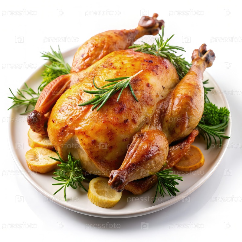 Горячая курица с розмарином и лимонными ломтиками на белой тарелке